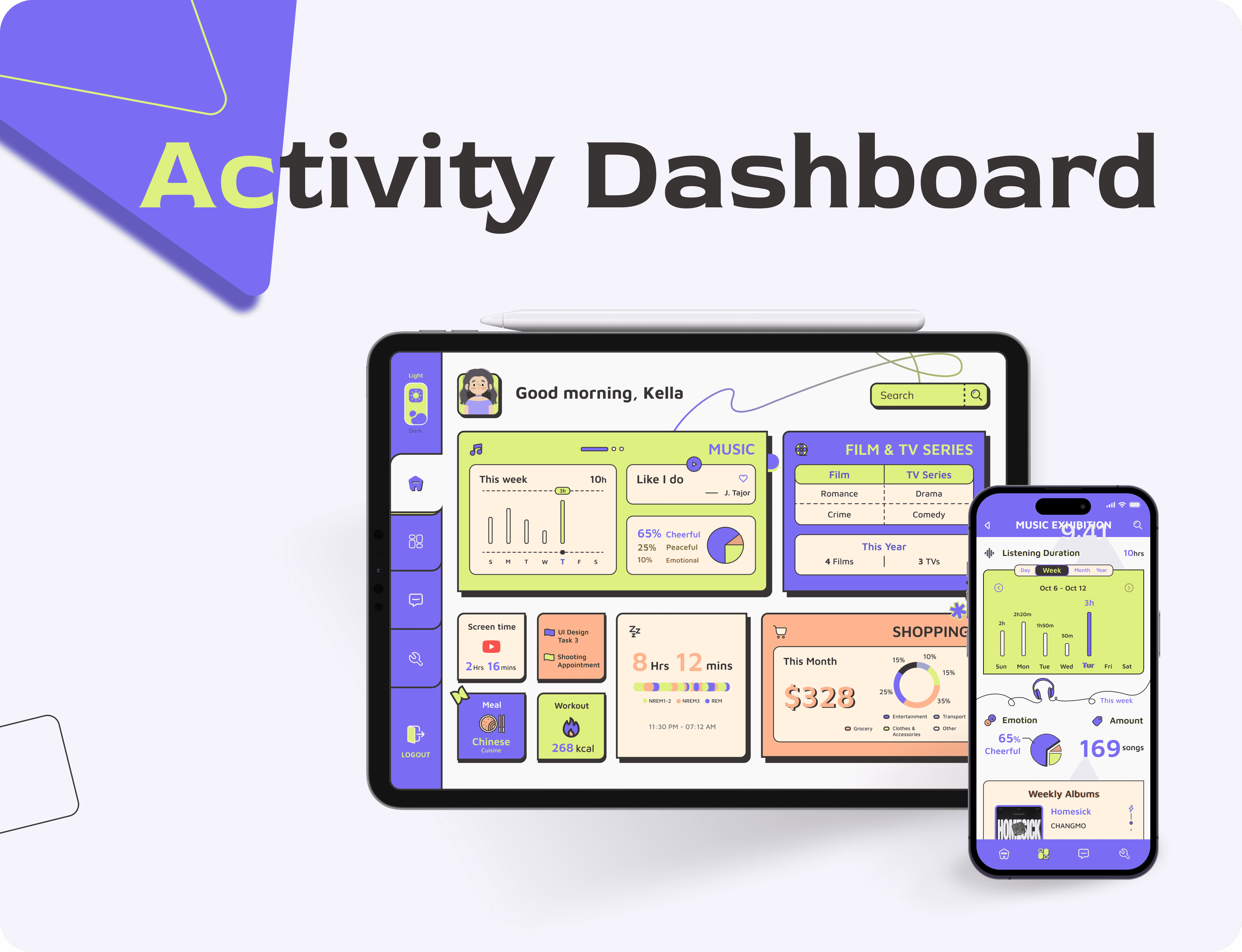 This personal dashboard makes daily tracking effortless and engaging. Designed with a bold, structured aesthetic, it supports balance across daily routines like music, sleep, spending, and screen time—helping users stay mindful and in control, one glance at a time.
